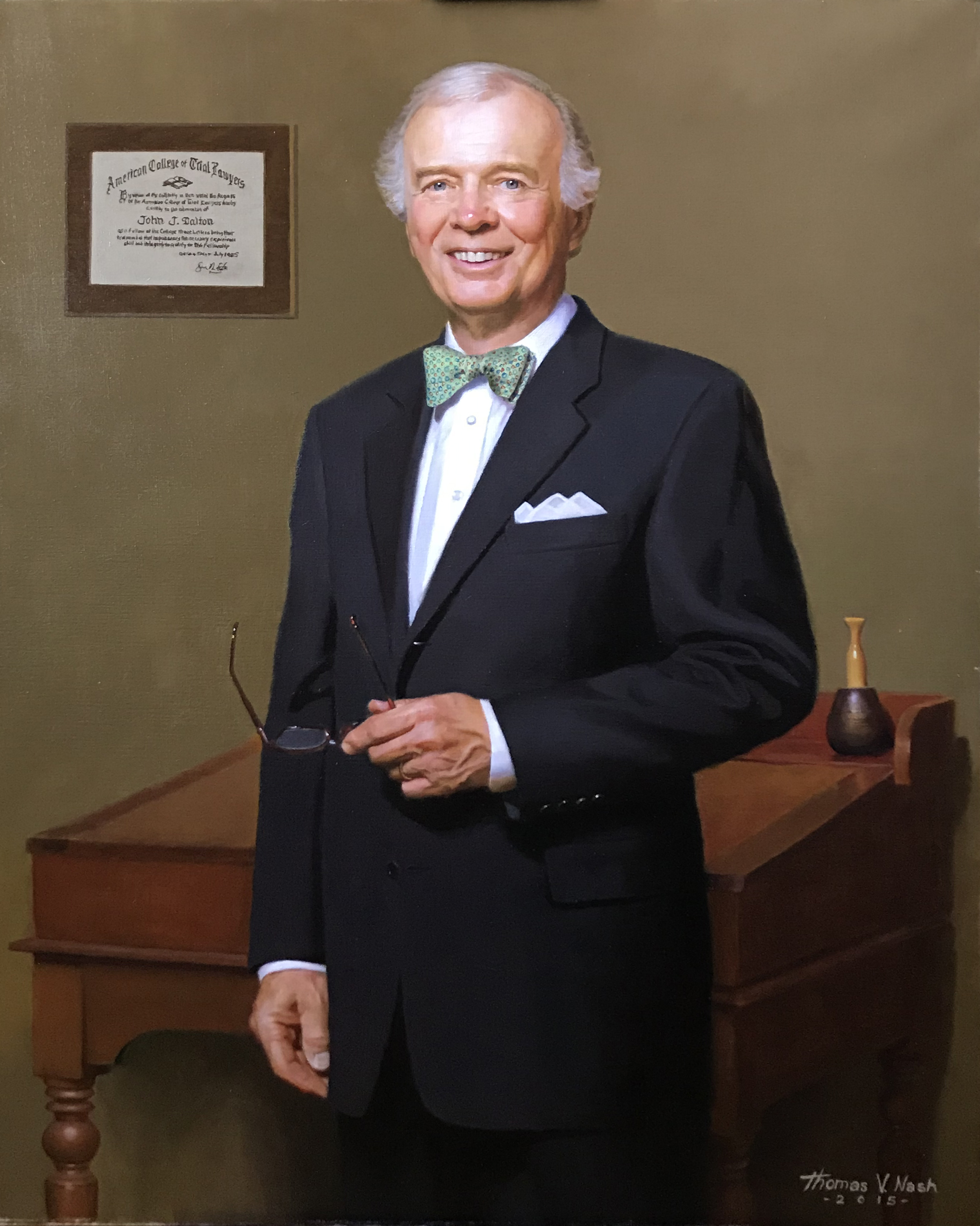 Tom painted this 48 x 36 inch oil portrait of Jack Dalton for the law firm TROUTMAN SANDERS when he retired. The plaque on the wall denotes his membership in the prestigious American College of Trial Lawyers of which he is a past president. See the unveiling.